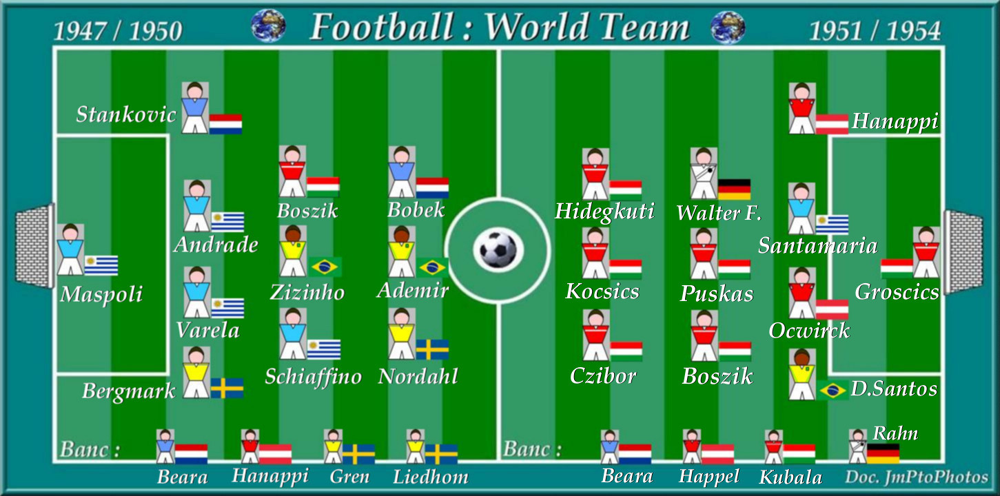 En 1950 l’Uruguay bat le Brésil, alors grandissime favori, en finale de la Coupe du Monde 2-1. Zizinho que Pelé considérait comme son maître n’ayant pu avec Ademir le buteur, venir à bout des uruguayens emmenés de main de maître par Schiaffino. En 1954, rebelote l’Allemagne de Fritz Walter bat le onze d’Or, la Hongrie, 3 à 2. Cette grande équipe hongroise qui sera invaincue pendant 6 ans (1950/1956).Atomisant par 2 fois l’Angleterre 7-1et 6-3 dans des matches dits du siècle ! Les anglais inventeurs du football et qui se croyaient à tort les rois à perpétuité.Le soulèvement de Budapest (26/10/1956) réprimé par les chars russes achèvera son règne magistral.Les vedettes magyars se retrouvant réfugiés en Europe de l’Ouest.voir l’article complet à ce sujet. :
